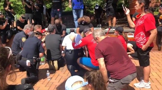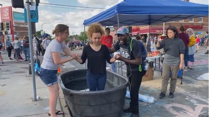 This image was taken a mere five blocks from where I grew up in Minneapolis, the site of George Floyd’s unfortunate death. Putting aside how deeply perverse it feels even over four years later to look at, it is also deeply revealing: it is clearly a religious rite being done through a supposedly secular lens of racial justice. As the Christian Post reported, “A number of Christian groups that have been holding revival services at the site where George Floyd died in Minneapolis say they're seeing many people turn to God in baptisms and miracles are happening.”