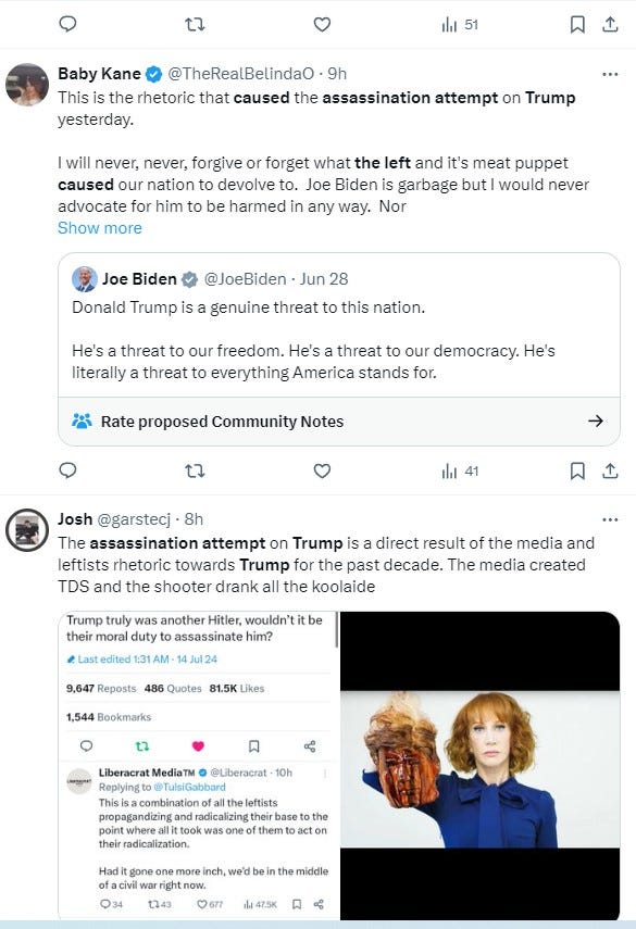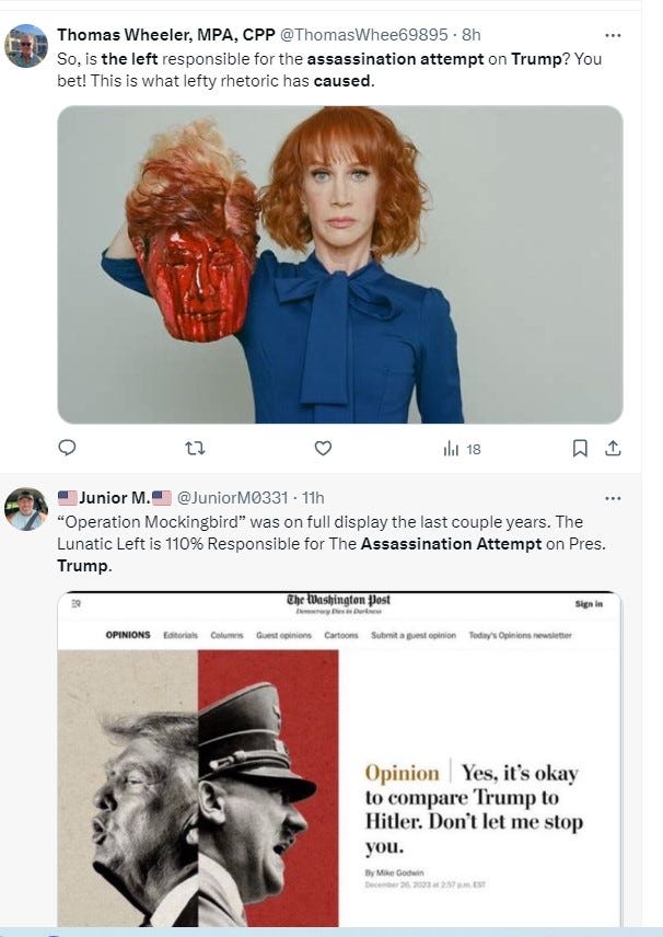 Just a reminder for those of you still fuming about me implying Donald Trump’s rhetoric was not responsible for the events of January 6th, 2021, or that Democratic rhetoric about “threats to democracy” did not cause the shooter to take his shot on the former president on July 12th, 2024.