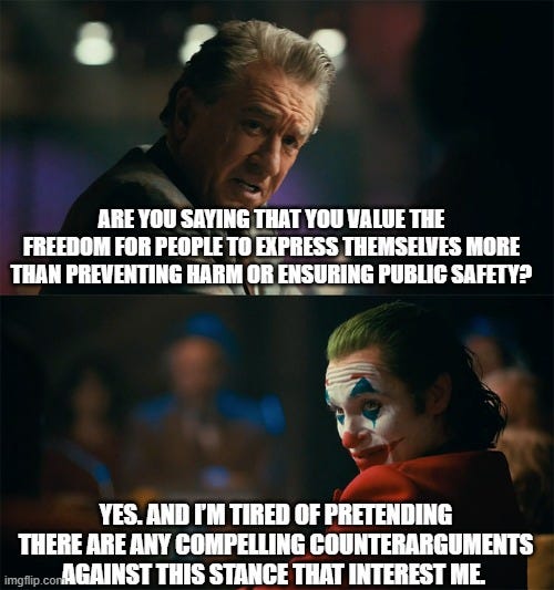Now, despite all this evidence marshaled here, one might still ask more in an abstract, philosophical sense: “Are you saying that you value the freedom for people to express themselves more than preventing harm or ensuring public safety?”